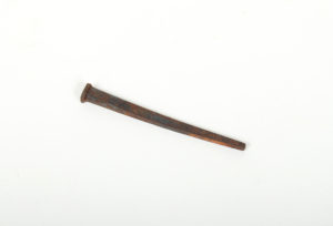 A single rusty iron nail. The nail has a rectangular, tapering head and cross section.