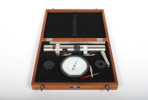 A black box with a blue velvet lining contains a black instrument. The instrument has a large glass-fronted dial on its surface indicating rotations per…