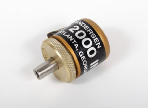 A brown case contains a blue and silver instrument. On one end is a black pump handle. On the opposite end is a hole for…