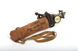 A leather case with a shoulder strap contains an instrument made of metal rubber and glass. At one end of the instrument is a red…